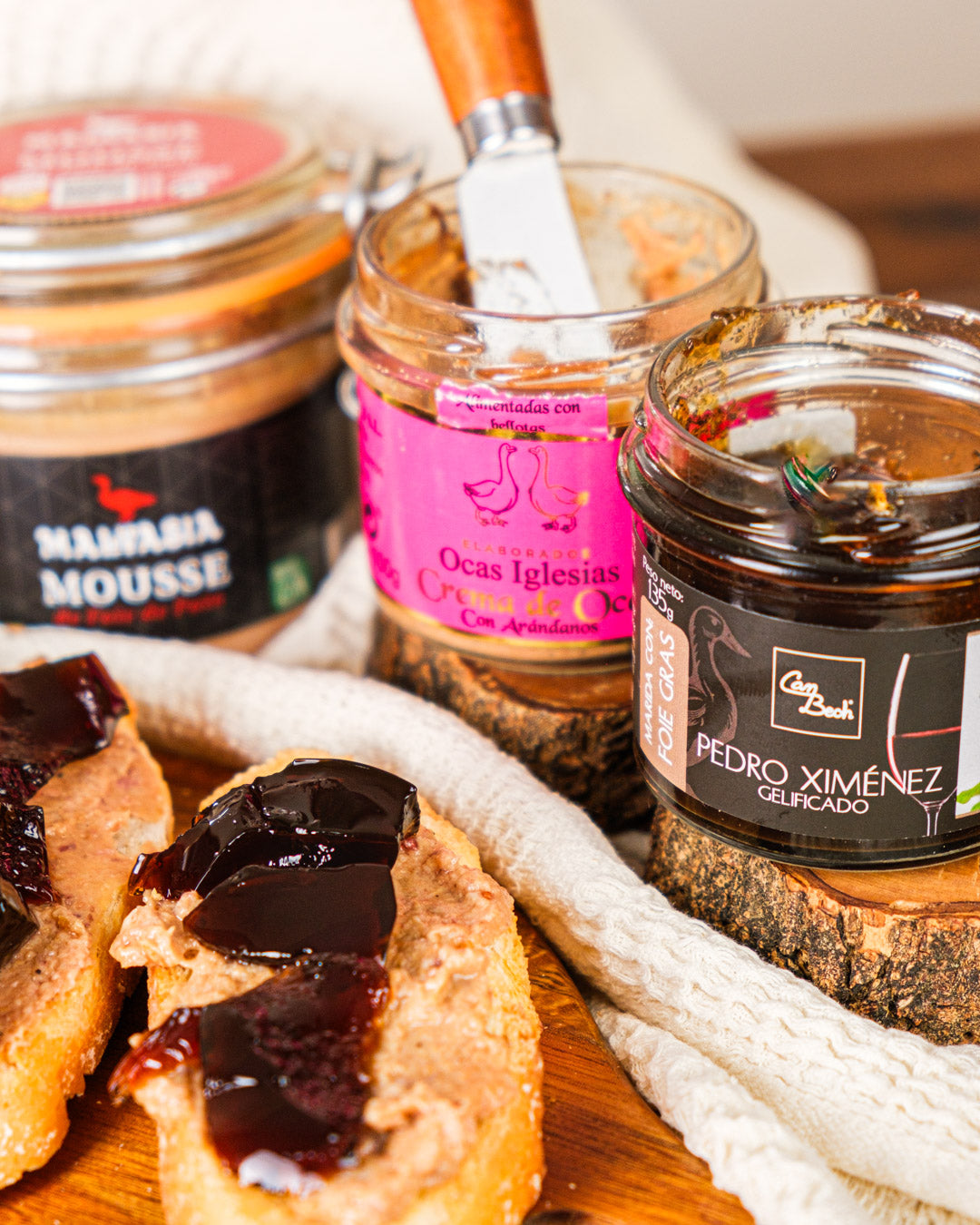 Descripción: Crema/terrina untable de carne de oca con un toque dulce y afrutado de arándanos, pensada para canapés y tostadas